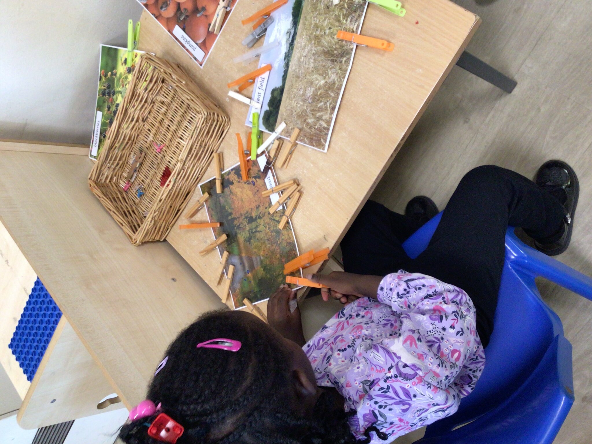 In the Nursery we have been exploring what Autumn is. We have looked for clues outside and found lots of things that have fallen from trees. Today we used our fine motor skills to peg Autumn colours to our photos. Using a pincer grip on pegs can strengthen muscles that are used when holding a pencil.