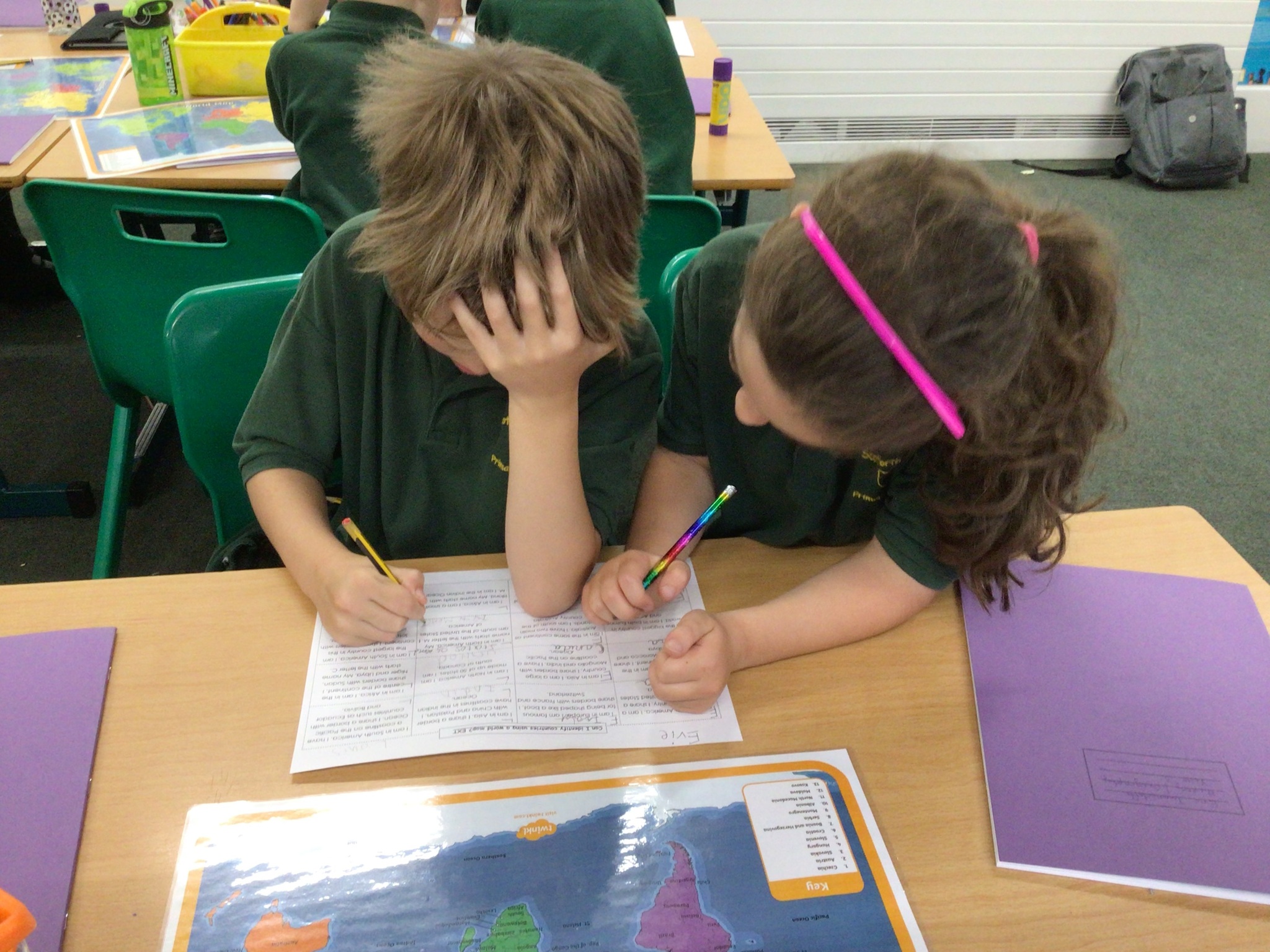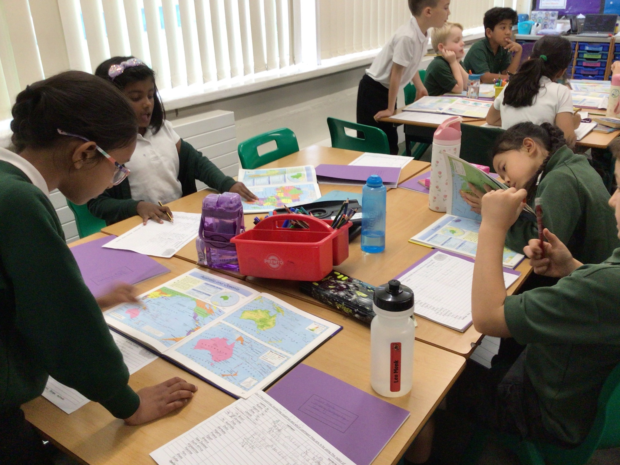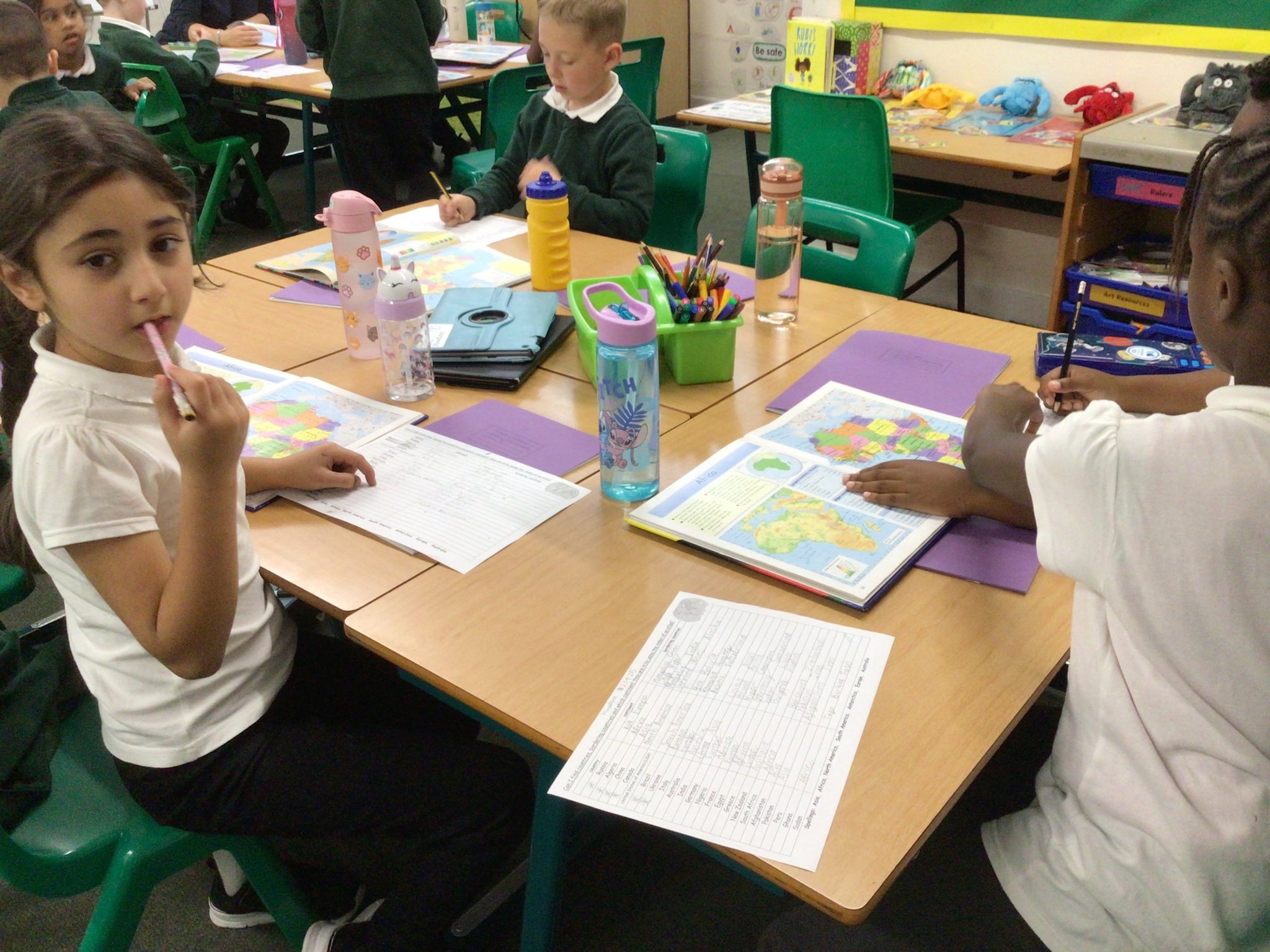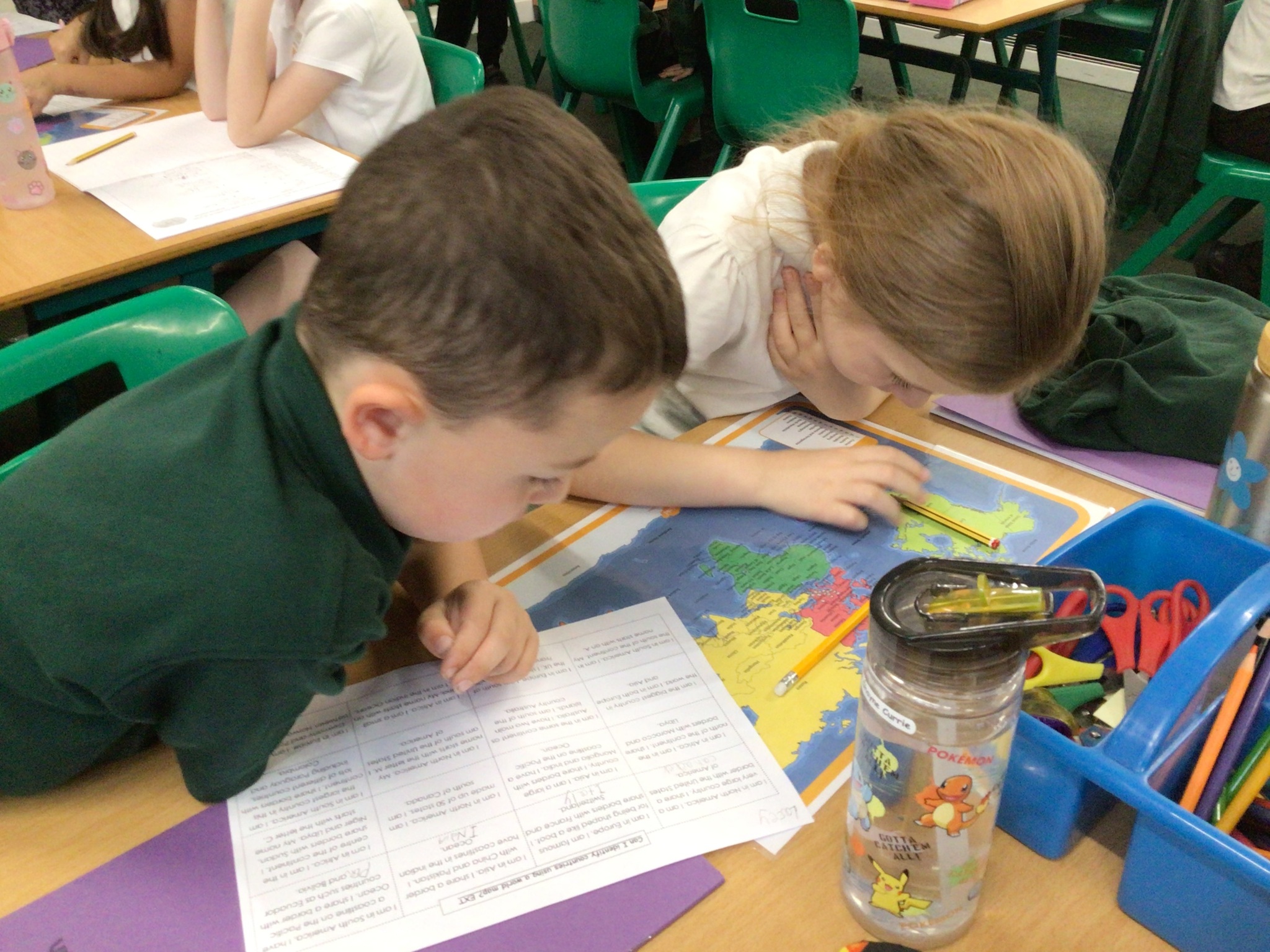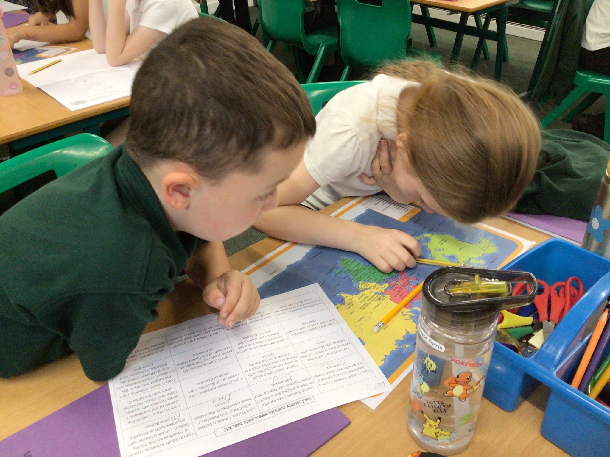 In geography we have been learning about the locations of different countries across the world. We have looked at the 7 continents, the 5 oceans, the Equator and the Arctic and Antarctic Circles. Today we had to read descriptions of different countries and use atlases and world maps to find out which countries they were.