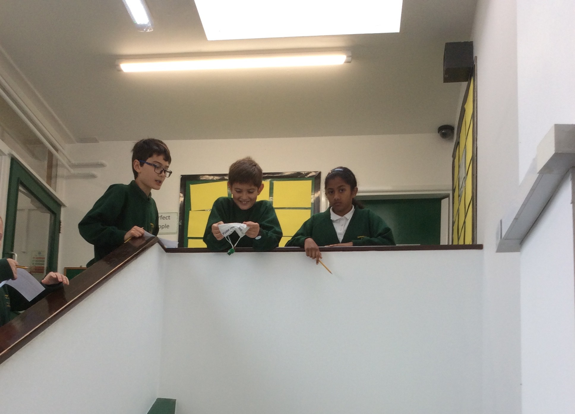 Year 6 were set the challenge of designing a parachute which would provide the slowest and safest descent for our 'person'. They could change the size of parachute, the material it was made from or the string length before carrying out a fair test, keeping all other variables the same. Once the parachutes were made, the children timed, recorded and photographed their investigation. Then they used the results to drawn conclusions about the forces in action and how these influenced their results.
