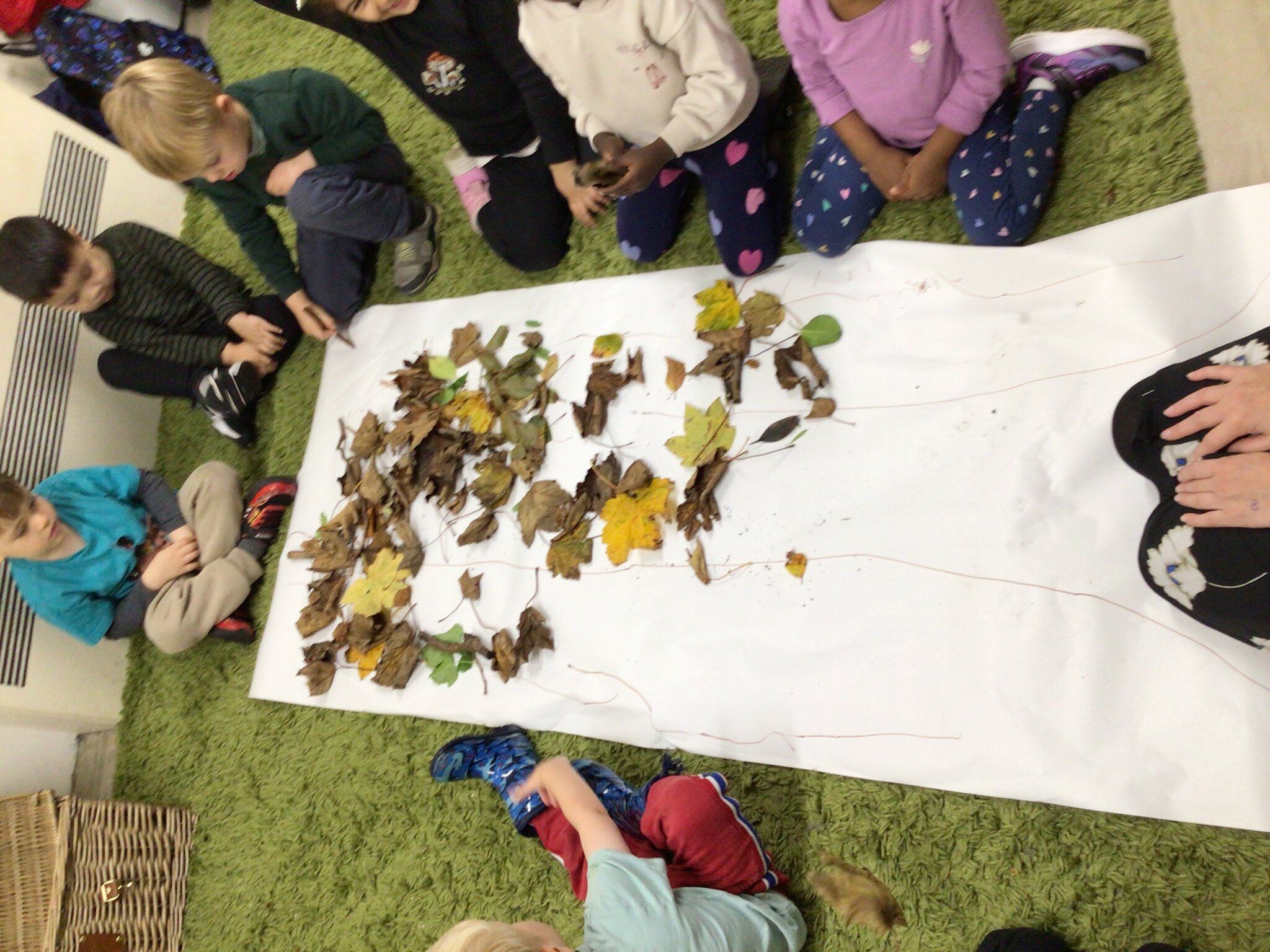 The children have been fascinated by the number of leaves collecting on our playground. We made our own tree using things we had found in the playground. We learnt some new vocabulary, trunk, branches, sticks and leaves.