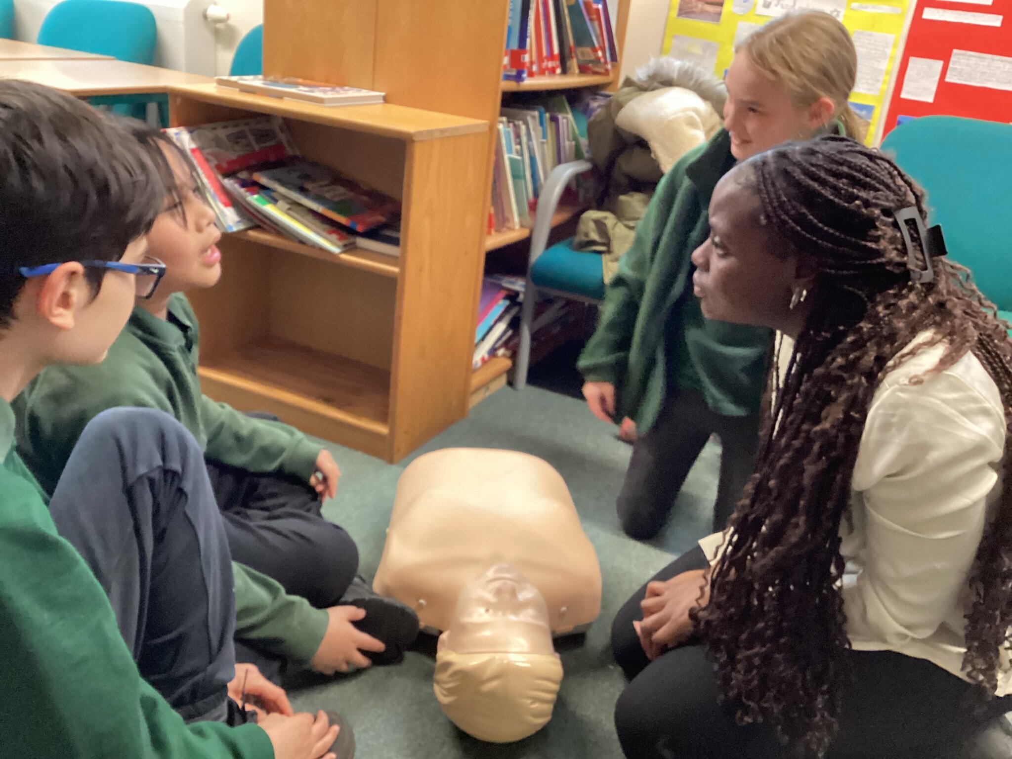 This afternoon we had four medical students from Lancaster University visiting our class. They told us about different aspects of keeping healthy, such as healthy eating, good sleep habits, exercise, personal hygiene and mental health. They also taught us what to do in an emergency and we had a go at practising CPR.