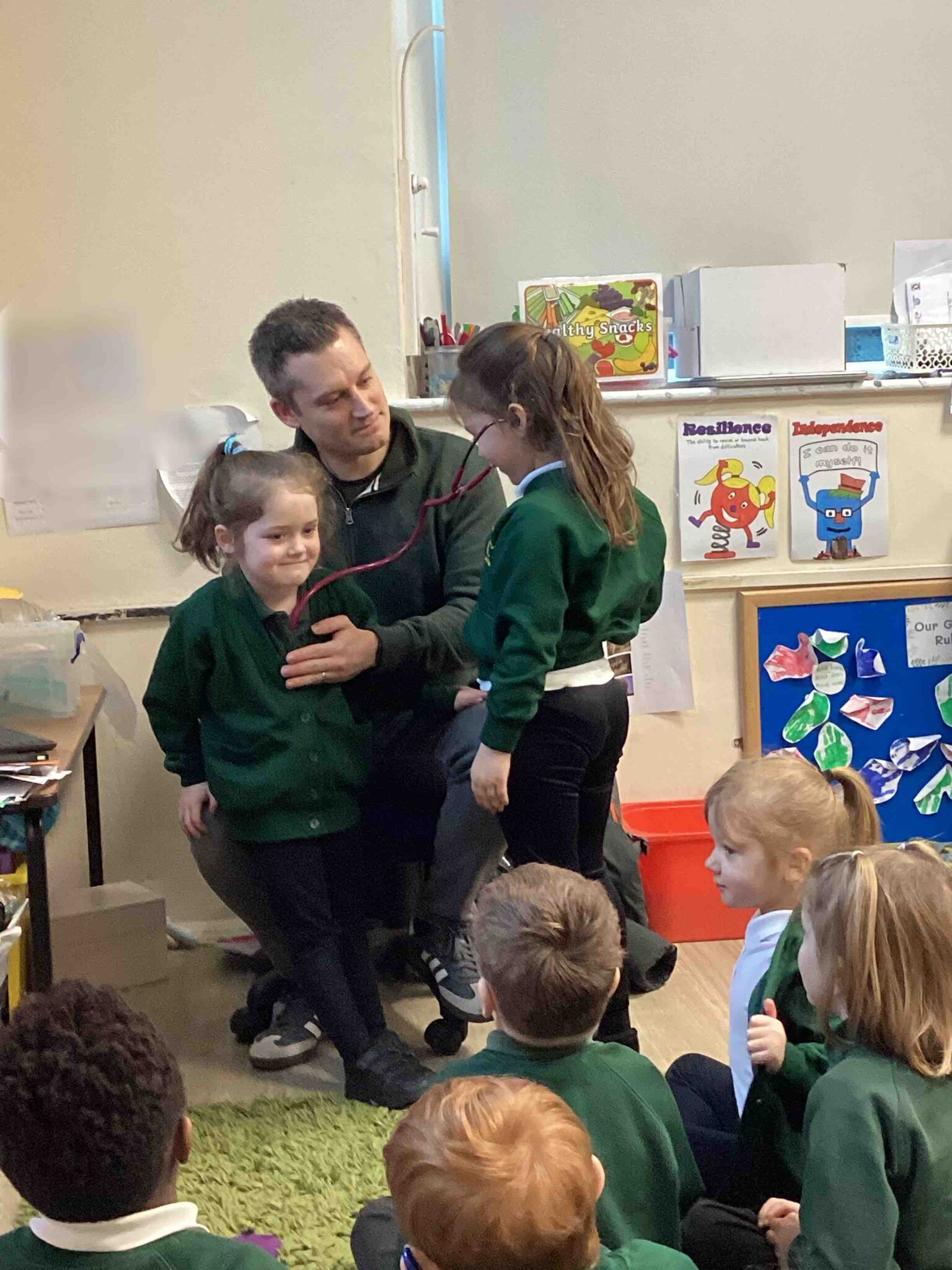 Yesterday we had a Doctor visit us in Reception. He showed us lots of different equipment, how to use some of them and what they are used for. We even got to listen to each others heart beats.