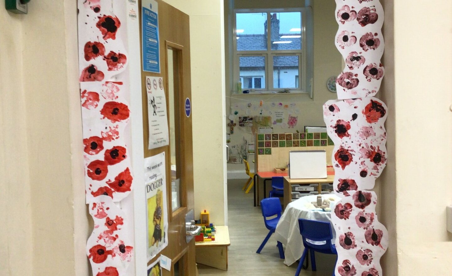 Today we remembered all people and animals killed or injured by war. We wanted to put our poppies outside but due to the bad weather we made an arch to walk under instead.