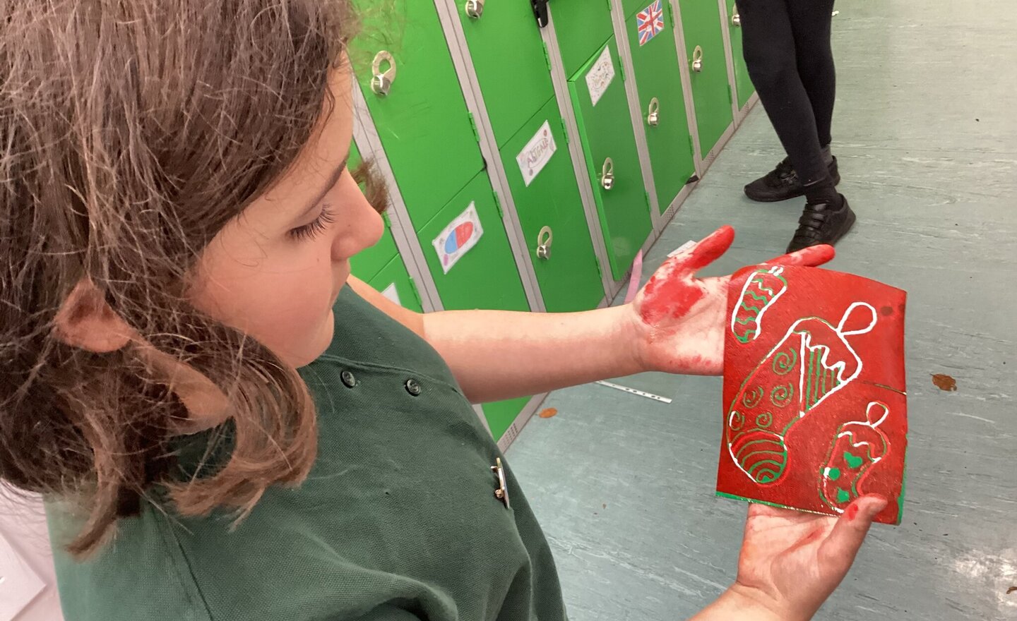 Today, we began our printing project, with the final product being our Christmas cards. The first stage involves making a simple print block and choosing the ink colour for the base of our design. It was really exciting to peel back and reveal our first print!