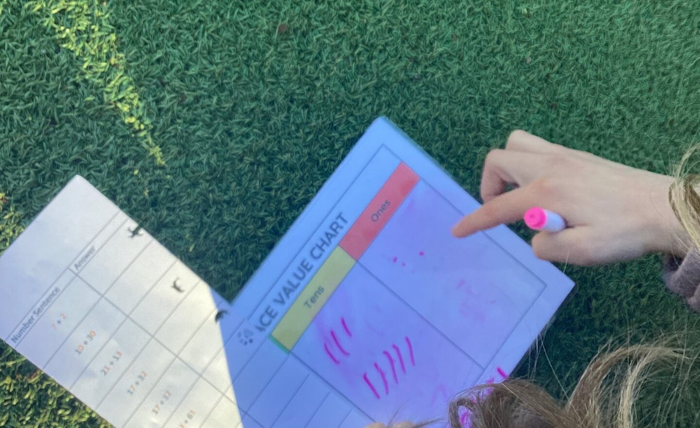 This morning, we were practising adding two two digit numbers with a fun activity outside. We had to add the numbers and then locate the answer around the playground. There was some great maths work going on!